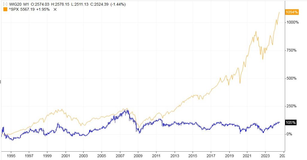 I tu jest przysłowiowy pies pogrzebany. Amerykańskie plany kapitałowe mają Wall Street i cały, najbardziej zróżnicowany na świecie rynek, kapitałowy. Jaki mają wybór polskie plany? Praktycznie żadnego. Jakakolwiek kilkumiesięczna „hossa” na GPW wywołuje pseudo fachowe prognozy i wzrost krytyki giełdy nowojorskiej. Tylko że te pseudo prognozy idą w zapomnienie, a Wall Street rośnie dalej i czym dłużej, tym bardziej bezlitośnie bije GPW na wszelkie możliwe sposoby. Celowo piszę tutaj „hossa” w cudzysłowie, gdyż nie jest to żaden rynek wzrostowy tylko kolejny rozdział obijania się głównych indeksów warszawskiego parkietu o te same wartości od ponad 20 lat. A brak długofalowego wzrostu zawsze dla planów emerytalnych będzie zniechęcający. Co gorsza, – nie ma żadnych szans na poprawę tej sytuacji, bo błędy popełniono dawno temu i mało kto potrafi zrozumieć, na czym one polegały.